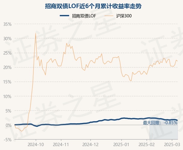 证券之星消息,3月7日,招商双债LOF最新单位净值为1.5903元,累计净值为1.7293元,较前一交易日下跌0.19%。历史数据显示该基金近1个月下跌0.85%,近3个月上涨0.48%,近6个月上涨1.53%,近1年上涨3.31%。该基金近6个月的累计收益率走势如下图:
