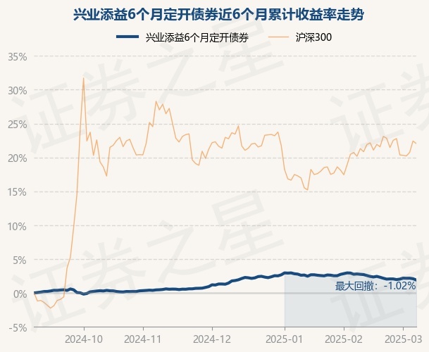 证券之星消息,3月7日,兴业添益6个月定开债券最新单位净值为1.0317元,累计净值为1.0907元,较前一交易日下跌0.18%。历史数据显示该基金近1个月下跌1.0%,近3个月上涨0.61%,近6个月上涨1.92%,近1年上涨4.43%。该基金近6个月的累计收益率走势如下图: