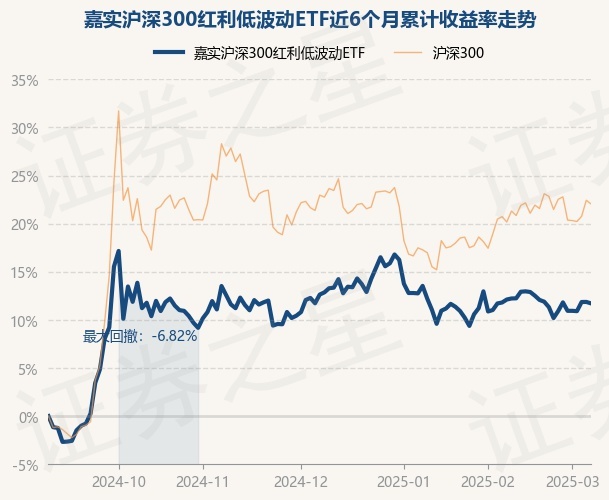 证券之星消息,3月7日,嘉实沪深300红利低波动ETF最新单位净值为1.3412元,累计净值为1.6075元,较前一交易日下跌0.13%。历史数据显示该基金近1个月上涨0.01%,近3个月下跌0.81%,近6个月上涨11.65%,近1年上涨10.72%。该基金近6个月的累计收益率走势如下图: