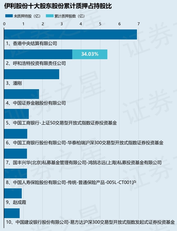 截止本公告日,股东呼和浩特投资有限责任公司已累计质押股份1.83亿股,占其持股总数的34.03%。本次质押后伊利股份十大股东的累计质押股份占持股比例(占持股比例的计算以公司最新一期财务报表公布的十大股东的持股总数为基准)见下图: