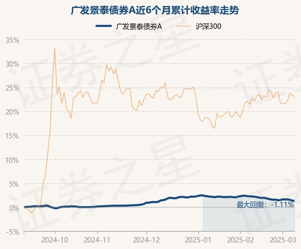 证券之星消息,3月10日,广发景泰债券A最新单位净值为1.0713元,累计净值为1.0713元,较前一交易日下跌0.05%。历史数据显示该基金近1个月下跌0.93%,近3个月下跌0.07%,近6个月上涨1.33%,近1年上涨3.73%。该基金近6个月的累计收益率走势如下图:
