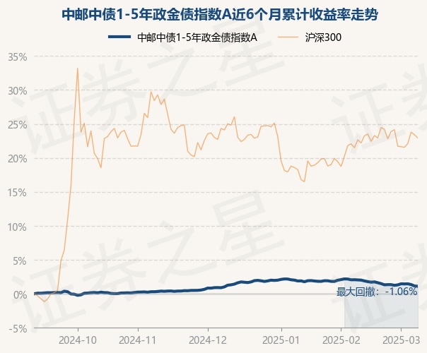 证券之星消息,3月10日,中邮中债1-5年政金债指数A最新单位净值为1.0926元,累计净值为1.1166元,较前一交易日下跌0.05%。历史数据显示该基金近1个月下跌0.93%,近3个月下跌0.16%,近6个月上涨1.11%,近1年上涨3.73%。该基金近6个月的累计收益率走势如下图: