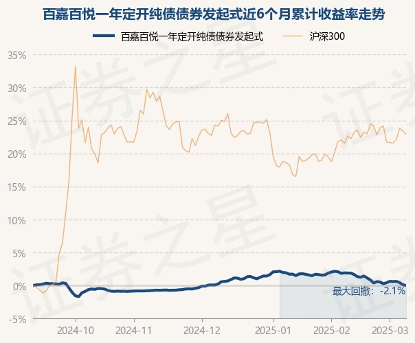 证券之星消息,3月10日,百嘉百悦一年定开纯债债券发起式最新单位净值为1.0265元,累计净值为1.0571元,较前一交易日下跌0.09%。历史数据显示该基金近1个月下跌1.79%,近3个月下跌0.55%,近6个月上涨0.02%,近1年上涨2.57%。该基金近6个月的累计收益率走势如下图: