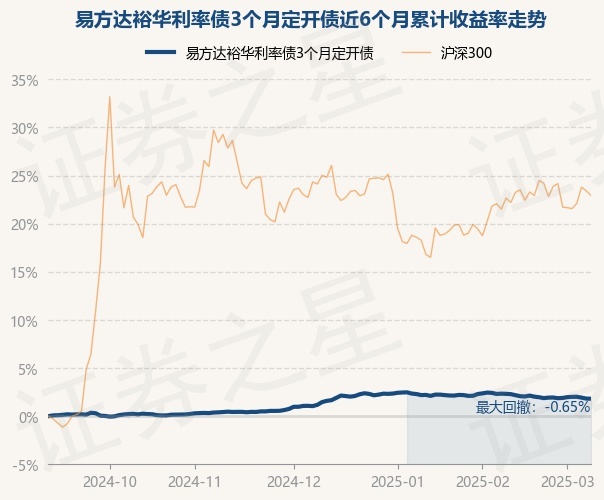 证券之星消息,3月10日,易方达裕华利率债3个月定开债最新单位净值为1.0085元,累计净值为1.111元,较前一交易日下跌0.01%。历史数据显示该基金近1个月下跌0.48%,近3个月上涨0.35%,近6个月上涨1.81%,近1年上涨4.03%。该基金近6个月的累计收益率走势如下图: