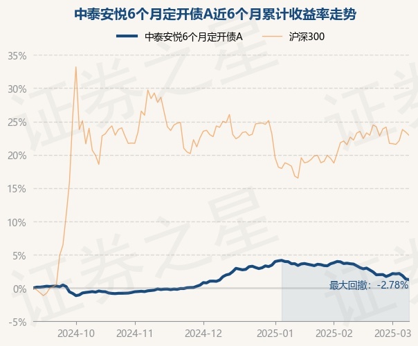 证券之星消息,3月10日,中泰安悦6个月定开债A最新单位净值为1.0214元,累计净值为1.0834元,较前一交易日下跌0.1%。历史数据显示该基金近1个月下跌2.33%,近3个月下跌0.44%,近6个月上涨1.25%,近1年上涨3.85%。该基金近6个月的累计收益率走势如下图: