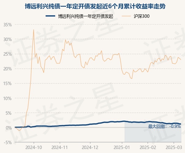 证券之星消息,3月10日,博远利兴纯债一年定开债发起最新单位净值为1.0322元,累计净值为1.0793元,较前一交易日下跌0.03%。历史数据显示该基金近1个月下跌0.68%,近3个月下跌0.25%,近6个月上涨1.15%,近1年上涨3.12%。该基金近6个月的累计收益率走势如下图: