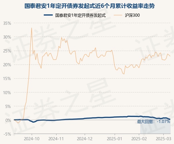 证券之星消息,3月10日,国泰君安1年定开债券发起式最新单位净值为1.0266元,累计净值为1.116元,较前一交易日下跌0.04%。历史数据显示该基金近1个月下跌0.85%,近3个月下跌0.48%,近6个月上涨0.23%,近1年上涨2.21%。该基金近6个月的累计收益率走势如下图: