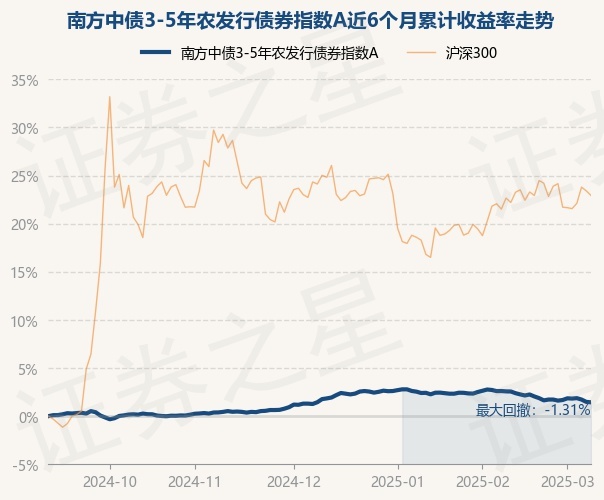 证券之星消息,3月10日,南方中债3-5年农发行债券指数A最新单位净值为1.0998元,累计净值为1.2528元,较前一交易日下跌0.05%。历史数据显示该基金近1个月下跌1.13%,近3个月下跌0.33%,近6个月上涨1.44%,近1年上涨4.2%。该基金近6个月的累计收益率走势如下图: