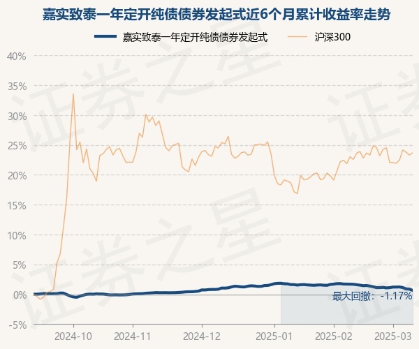 证券之星消息,3月11日,嘉实致泰一年定开纯债债券发起式最新单位净值为1.034元,累计净值为1.0736元,较前一交易日下跌0.2%。历史数据显示该基金近1个月下跌1.03%,近3个月下跌0.38%,近6个月上涨0.64%,近1年上涨2.66%。该基金近6个月的累计收益率走势如下图: