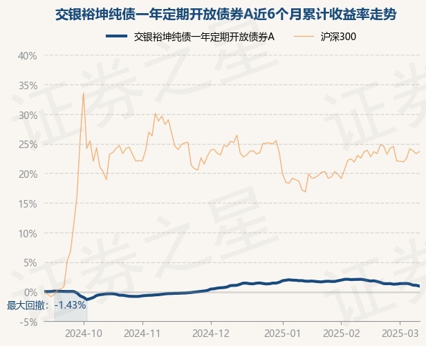证券之星消息,3月11日,交银裕坤纯债一年定期开放债券A最新单位净值为1.0837元,累计净值为1.1697元,较前一交易日下跌0.14%。历史数据显示该基金近1个月下跌1.1%,近3个月下跌0.12%,近6个月上涨0.94%,近1年上涨2.79%。该基金近6个月的累计收益率走势如下图: