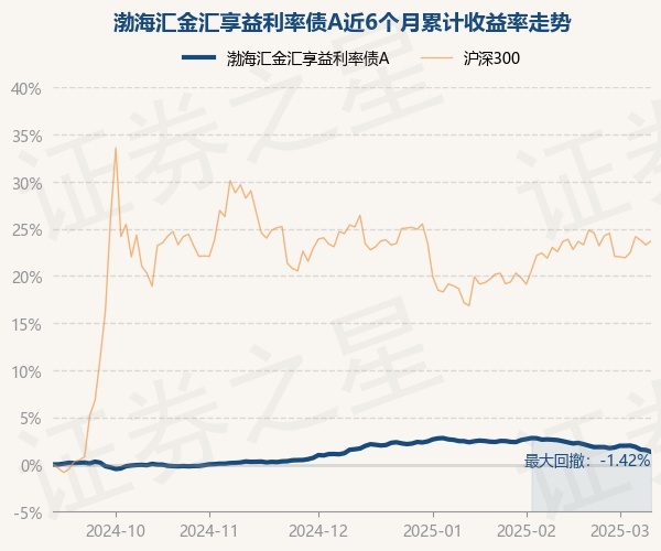 证券之星消息,3月11日,渤海汇金汇享益利率债A最新单位净值为1.031元,累计净值为1.046元,较前一交易日下跌0.19%。历史数据显示该基金近1个月下跌1.29%,近3个月下跌0.28%,近6个月上涨1.34%,近1年上涨3.96%。该基金近6个月的累计收益率走势如下图: