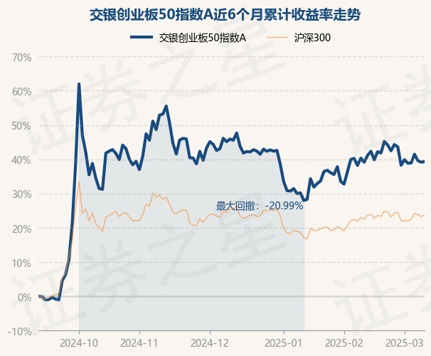 证券之星消息,3月11日,交银创业板50指数A最新单位净值为1.3639元,累计净值为1.5009元,较前一交易日上涨0.12%。历史数据显示该基金近1个月上涨0.81%,近3个月下跌4.26%,近6个月上涨39.13%,近1年上涨18.78%。该基金近6个月的累计收益率走势如下图: