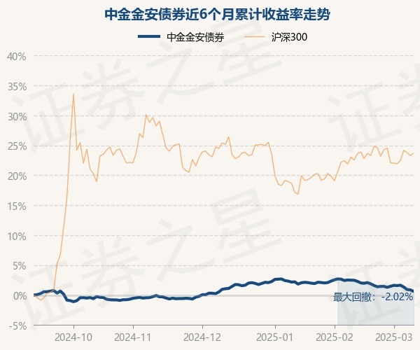证券之星消息,3月11日,中金金安债券最新单位净值为1.0162元,累计净值为1.0512元,较前一交易日下跌0.25%。历史数据显示该基金近1个月下跌1.85%,近3个月下跌0.43%,近6个月上涨0.62%,近1年上涨3.69%。该基金近6个月的累计收益率走势如下图: