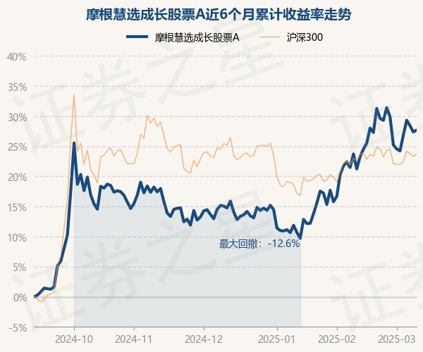 证券之星消息,3月11日,摩根慧选成长股票A最新单位净值为1.2744元,累计净值为1.2744元,较前一交易日上涨0.25%。历史数据显示该基金近1个月上涨5.11%,近3个月上涨11.26%,近6个月上涨27.67%,近1年上涨19.76%。该基金近6个月的累计收益率走势如下图: