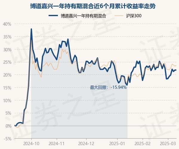 证券之星消息,3月11日,博道嘉兴一年持有期混合最新单位净值为0.8639元,累计净值为0.8639元,较前一交易日上涨0.0%。历史数据显示该基金近1个月下跌1.03%,近3个月下跌2.98%,近6个月上涨21.59%,近1年上涨1.09%。该基金近6个月的累计收益率走势如下图: