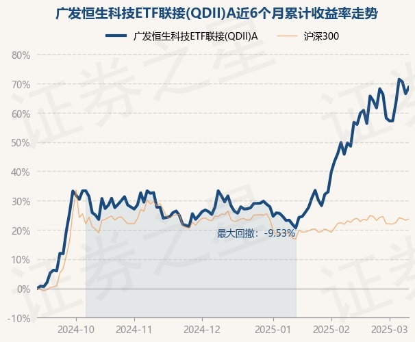 证券之星消息,3月11日,广发恒生科技ETF联接(QDII)A最新单位净值为1.0302元,累计净值为1.0302元,较前一交易日上涨1.34%。历史数据显示该基金近1个月上涨15.71%,近3个月上涨30.22%,近6个月上涨68.72%,近1年上涨70.03%。该基金近6个月的累计收益率走势如下图: