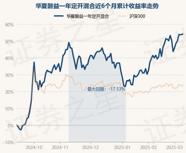 证券之星消息,3月11日,华夏磐益一年定开混合最新单位净值为1.2241元,累计净值为1.2831元,较前一交易日上涨0.19%。历史数据显示该基金近1个月上涨10.17%,近3个月上涨6.88%,近6个月上涨54.27%,近1年上涨38.93%。该基金近6个月的累计收益率走势如下图: