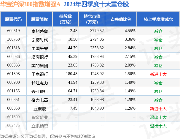 华宝沪深300指数增强A为指数型-股票基金,根据最新一期基金季报显示,该基金资产配置:股票占净值比93.48%,债券占净值比5.97%,现金占净值比3.91%。基金十大重仓股如下: