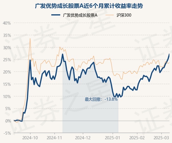 证券之星消息,3月11日,广发优势成长股票A最新单位净值为0.4165元,累计净值为0.4165元,较前一交易日上涨1.54%。历史数据显示该基金近1个月上涨8.75%,近3个月上涨3.15%,近6个月上涨27.1%,近1年上涨8.21%。该基金近6个月的累计收益率走势如下图: