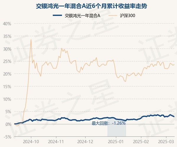 证券之星消息,3月11日,交银鸿光一年混合A最新单位净值为1.0397元,累计净值为1.0397元,较前一交易日下跌0.2%。历史数据显示该基金近1个月下跌0.02%,近3个月上涨0.7%,近6个月上涨2.9%,近1年上涨3.91%。该基金近6个月的累计收益率走势如下图: