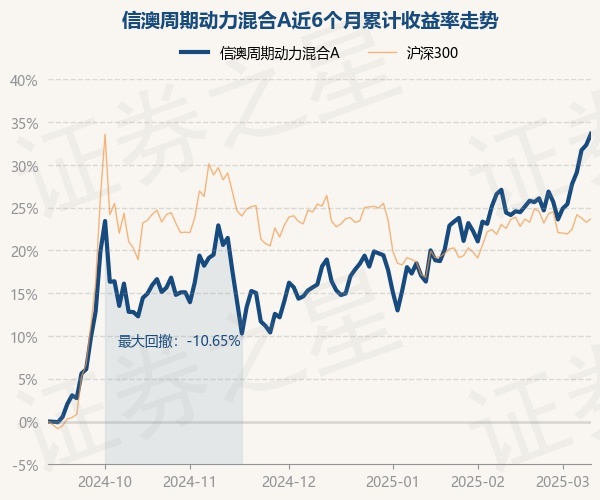 证券之星消息,3月11日,信澳周期动力混合A最新单位净值为1.3904元,累计净值为1.3904元,较前一交易日上涨0.99%。历史数据显示该基金近1个月上涨5.57%,近3个月上涨13.11%,近6个月上涨33.63%,近1年上涨19.04%。该基金近6个月的累计收益率走势如下图:
