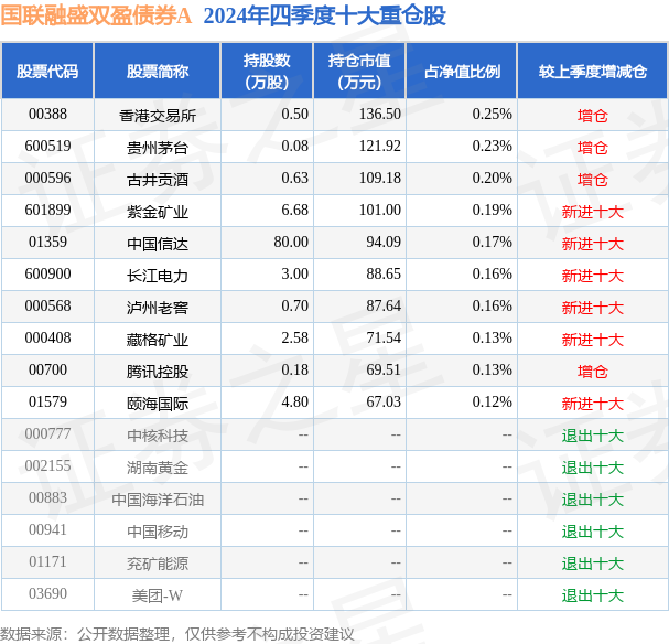 国联融盛双盈债券A为债券型-混合二级基金,根据最新一期基金季报显示,该基金资产配置:股票占净值比8.12%,债券占净值比118.73%,现金占净值比4.57%。基金十大重仓股如下:
