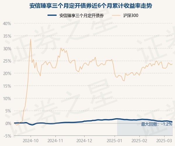 证券之星消息,3月11日,安信臻享三个月定开债券最新单位净值为1.0371元,累计净值为1.0671元,较前一交易日下跌0.12%。历史数据显示该基金近1个月下跌0.96%,近3个月下跌0.58%,近6个月上涨0.49%,近1年上涨2.39%。该基金近6个月的累计收益率走势如下图: