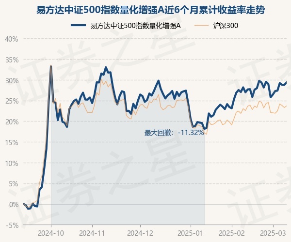 证券之星消息,3月11日,易方达中证500指数量化增强A最新单位净值为0.9442元,累计净值为0.9442元,较前一交易日上涨0.44%。历史数据显示该基金近1个月上涨1.81%,近3个月上涨0.58%,近6个月上涨29.34%,近1年上涨13.32%。该基金近6个月的累计收益率走势如下图: