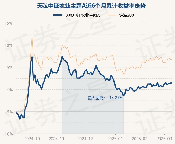 证券之星消息,3月11日,天弘中证农业主题A最新单位净值为0.6781元,累计净值为0.6781元,较前一交易日上涨0.0%。历史数据显示该基金近1个月上涨3.59%,近3个月下跌3.64%,近6个月上涨14.68%,近1年下跌1.74%。该基金近6个月的累计收益率走势如下图: