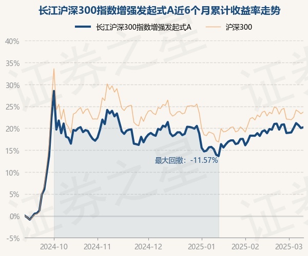 证券之星消息,3月11日,长江沪深300指数增强发起式A最新单位净值为0.8072元,累计净值为0.8072元,较前一交易日上涨0.15%。历史数据显示该基金近1个月上涨1.64%,近3个月下跌0.1%,近6个月上涨20.21%,近1年上涨10.68%。该基金近6个月的累计收益率走势如下图:
