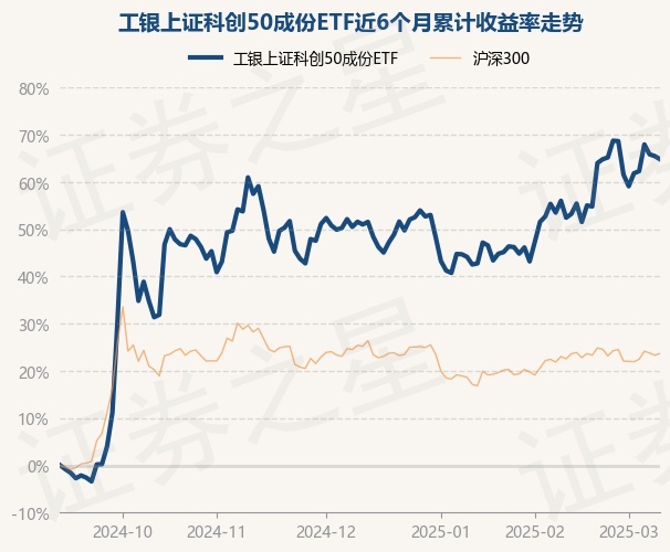 证券之星消息,3月11日,工银上证科创50成份ETF最新单位净值为1.131元,累计净值为0.7881元,较前一交易日下跌0.4%。历史数据显示该基金近1个月上涨7.37%,近3个月上涨9.15%,近6个月上涨64.82%,近1年上涨34.2%。该基金近6个月的累计收益率走势如下图: