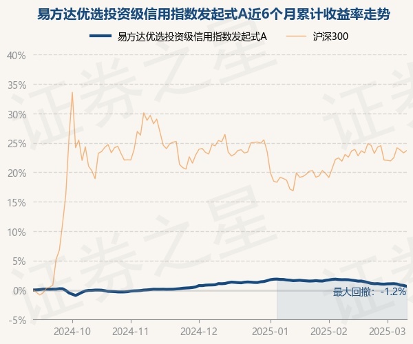 证券之星消息,3月11日,易方达优选投资级信用指数发起式A最新单位净值为1.0249元,累计净值为1.0479元,较前一交易日下跌0.16%。历史数据显示该基金近1个月下跌1.11%,近3个月下跌0.44%,近6个月上涨0.62%,近1年上涨2.79%。该基金近6个月的累计收益率走势如下图: