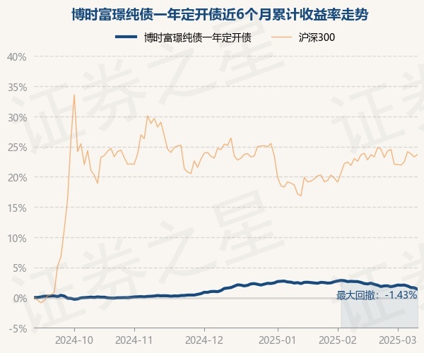 证券之星消息,3月11日,博时富璟纯债一年定开债最新单位净值为1.0228元,累计净值为1.1069元,较前一交易日下跌0.24%。历史数据显示该基金近1个月下跌1.28%,近3个月下跌0.2%,近6个月上涨1.37%,近1年上涨4.08%。该基金近6个月的累计收益率走势如下图: