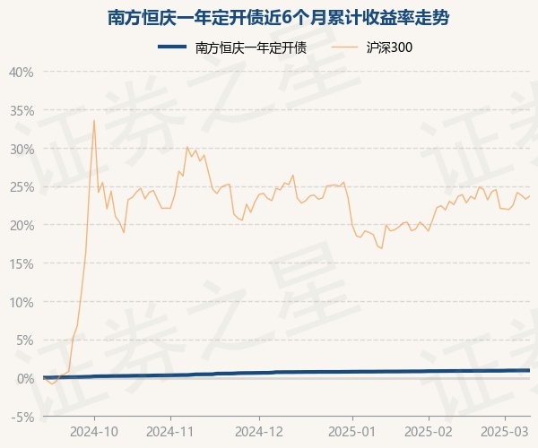 证券之星消息,3月11日,南方恒庆一年定开债最新单位净值为1.028元,累计净值为1.1107元,较前一交易日上涨0.0%。历史数据显示该基金近1个月上涨0.09%,近3个月上涨0.22%,近6个月上涨0.95%,近1年上涨2.11%。该基金近6个月的累计收益率走势如下图: