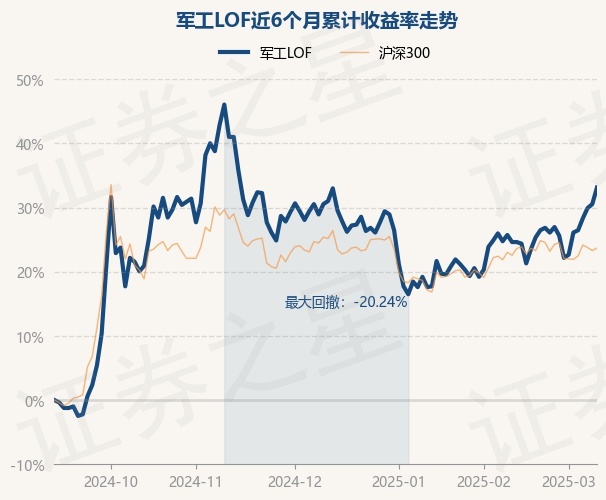 证券之星消息,3月11日,军工LOF最新单位净值为1.081元,累计净值为1.746元,较前一交易日上涨1.98%。历史数据显示该基金近1个月上涨6.71%,近3个月上涨1.6%,近6个月上涨33.13%,近1年上涨20.24%。该基金近6个月的累计收益率走势如下图: