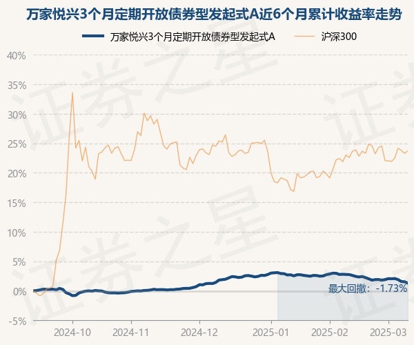 证券之星消息,3月11日,万家悦兴3个月定期开放债券型发起式A最新单位净值为1.0398元,累计净值为1.1194元,较前一交易日下跌0.23%。历史数据显示该基金近1个月下跌1.46%,近3个月下跌0.57%,近6个月上涨1.31%,近1年上涨3.61%。该基金近6个月的累计收益率走势如下图: