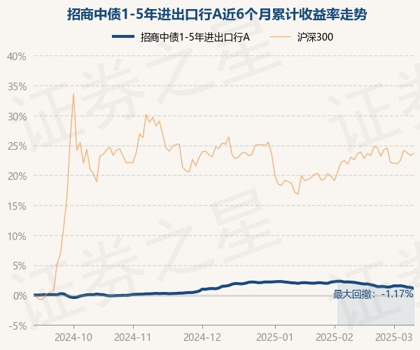 证券之星消息,3月11日,招商中债1-5年进出口行A最新单位净值为1.0463元,累计净值为1.1703元,较前一交易日下跌0.16%。历史数据显示该基金近1个月下跌1.06%,近3个月下跌0.38%,近6个月上涨1.11%,近1年上涨3.75%。该基金近6个月的累计收益率走势如下图: