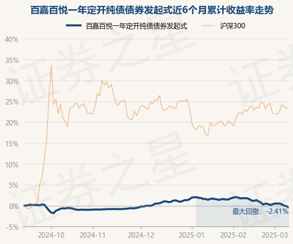 证券之星消息,3月11日,百嘉百悦一年定开纯债债券发起式最新单位净值为1.0232元,累计净值为1.0538元,较前一交易日下跌0.32%。历史数据显示该基金近1个月下跌2.18%,近3个月下跌0.91%,近6个月下跌0.4%,近1年上涨2.3%。该基金近6个月的累计收益率走势如下图: