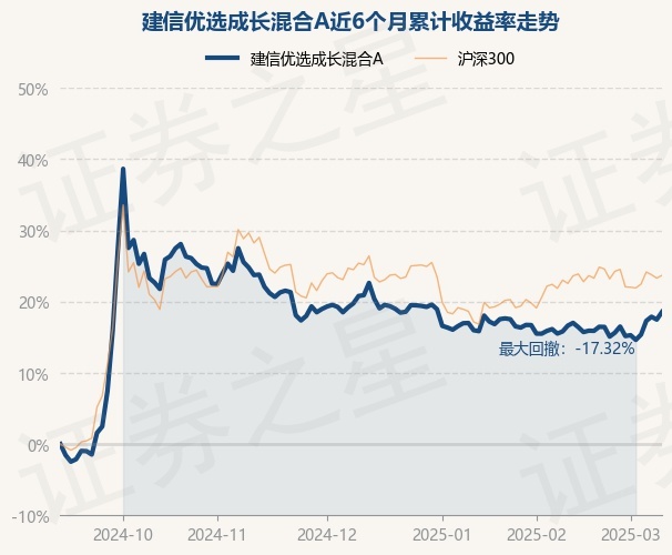 证券之星消息,3月11日,建信优选成长混合A最新单位净值为2.28元,累计净值为4.225元,较前一交易日上涨0.91%。历史数据显示该基金近1个月上涨2.63%,近3个月下跌1.94%,近6个月上涨18.56%,近1年上涨2.3%。该基金近6个月的累计收益率走势如下图: