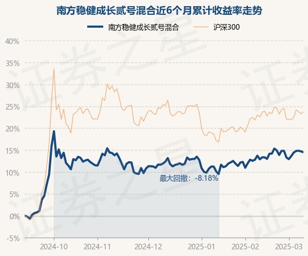 证券之星消息,3月11日,南方稳健成长贰号混合最新单位净值为0.3612元,累计净值为2.8953元,较前一交易日下跌0.17%。历史数据显示该基金近1个月上涨1.52%,近3个月上涨1.92%,近6个月上涨14.52%,近1年上涨4.91%。该基金近6个月的累计收益率走势如下图: