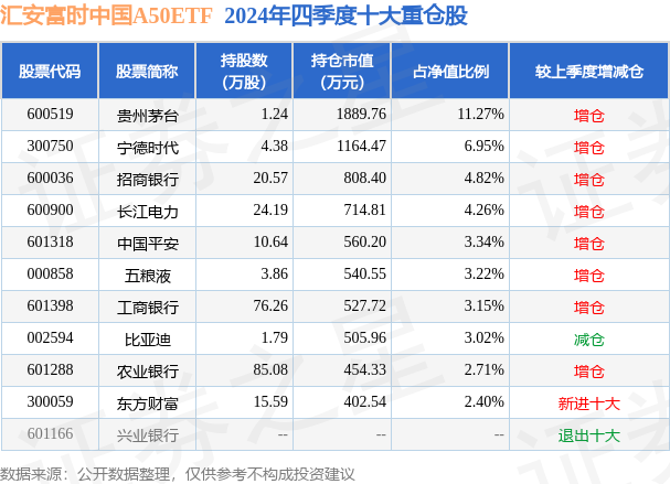 汇安富时中国A50ETF为指数型-股票基金,根据最新一期基金季报显示,该基金资产配置:股票占净值比98.35%,无债券类资产,现金占净值比2.33%。基金十大重仓股如下: