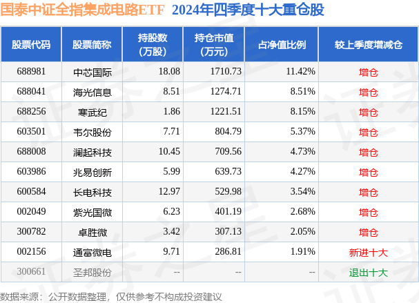 国泰中证全指集成电路ETF为指数型-股票基金,根据最新一期基金季报显示,该基金资产配置:股票占净值比99.28%,无债券类资产,现金占净值比0.97%。基金十大重仓股如下:
