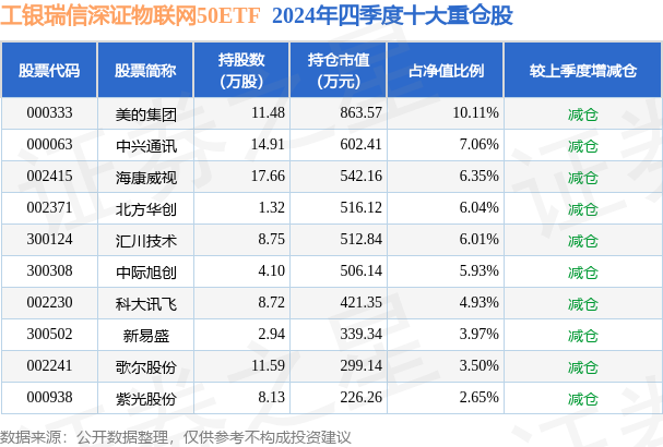工银瑞信深证物联网50ETF为指数型-股票基金,根据最新一期基金季报显示,该基金资产配置:股票占净值比99.43%,无债券类资产,现金占净值比0.66%。基金十大重仓股如下: