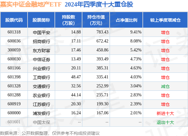 嘉实中证金融地产ETF为指数型-股票基金,根据最新一期基金季报显示,该基金资产配置:股票占净值比99.14%,无债券类资产,现金占净值比0.96%。基金十大重仓股如下: