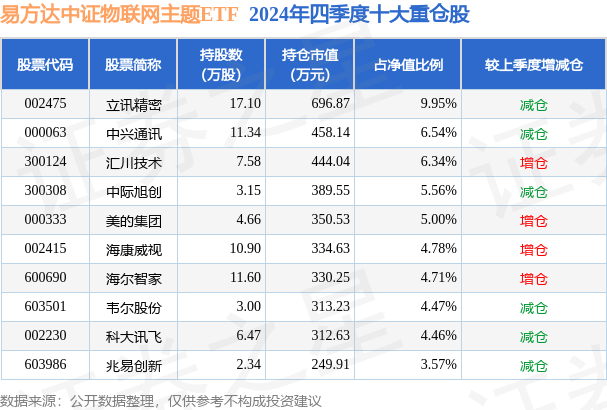 易方达中证物联网主题ETF为指数型-股票基金,根据最新一期基金季报显示,该基金资产配置:股票占净值比98.6%,无债券类资产,现金占净值比1.22%。基金十大重仓股如下: