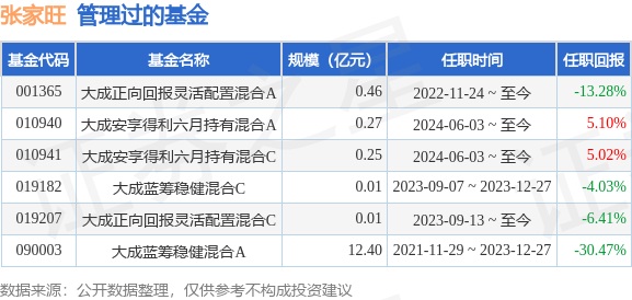 张家旺先生:中国国籍,工程硕士。2016年7月加入大成基金管理有限公司,曾任大成创新成长混合型证券投资基金(LOF)、大成高新技术产业股票型证券投资基金、大成优势企业混合型证券投资基金、大成睿裕六个月持有期股票型证券投资基金、大成睿鑫股票型证券投资基金、大成国企改革灵活配置混合型证券投资基金基金经理助理,现任研究部基金经理。具有基金从业资格。2022年11月24日担任大成正向回报灵活配置混合型证券投资基金基金经理。曾任大成蓝筹稳健证券投资基金基金经理。2024年6月3日担任大成安享得利六个月持有期混合型证券投资基金基金经理。