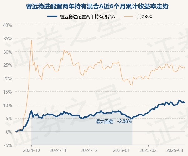证券之星消息,3月12日,睿远稳进配置两年持有混合A最新单位净值为1.0815元,累计净值为1.0815元,较前一交易日下跌0.31%。历史数据显示该基金近1个月上涨1.42%,近3个月上涨2.78%,近6个月上涨10.68%,近1年上涨13.54%。该基金近6个月的累计收益率走势如下图: