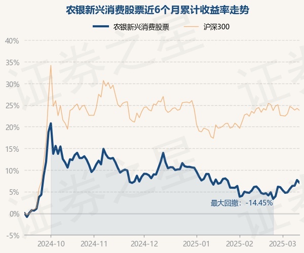 证券之星消息,3月12日,农银新兴消费股票最新单位净值为0.5477元,累计净值为0.5477元,较前一交易日下跌0.58%。历史数据显示该基金近1个月上涨1.75%,近3个月下跌6.05%,近6个月上涨7.06%,近1年下跌9.34%。该基金近6个月的累计收益率走势如下图: