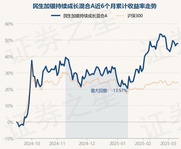 证券之星消息,3月12日,民生加银持续成长混合A最新单位净值为1.6396元,累计净值为1.6396元,较前一交易日上涨0.0%。历史数据显示该基金近1个月下跌1.74%,近3个月上涨9.92%,近6个月上涨46.5%,近1年上涨37.21%。该基金近6个月的累计收益率走势如下图: