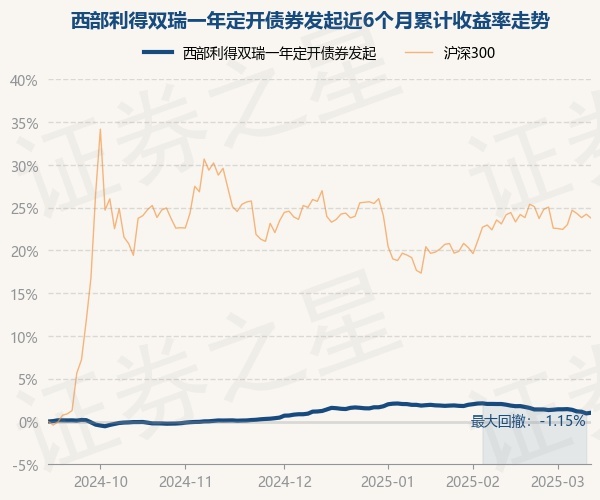 证券之星消息,3月12日,西部利得双瑞一年定开债券发起最新单位净值为1.0302元,累计净值为1.1293元,较前一交易日上涨0.08%。历史数据显示该基金近1个月下跌1.0%,近3个月下跌0.2%,近6个月上涨1.02%,近1年上涨3.5%。该基金近6个月的累计收益率走势如下图: